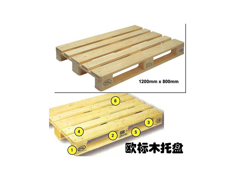 歐洲標準托盤[1] (Pallet EUR1,尺寸標準:1200mm×800mm×144mm)為常用型號,主要使用國家為歐洲大陸、德、法等。設計靜載6000KG,動載2000KG,為四面進叉。